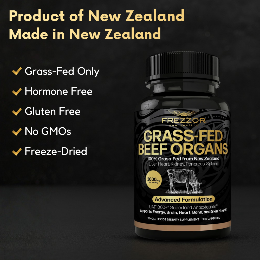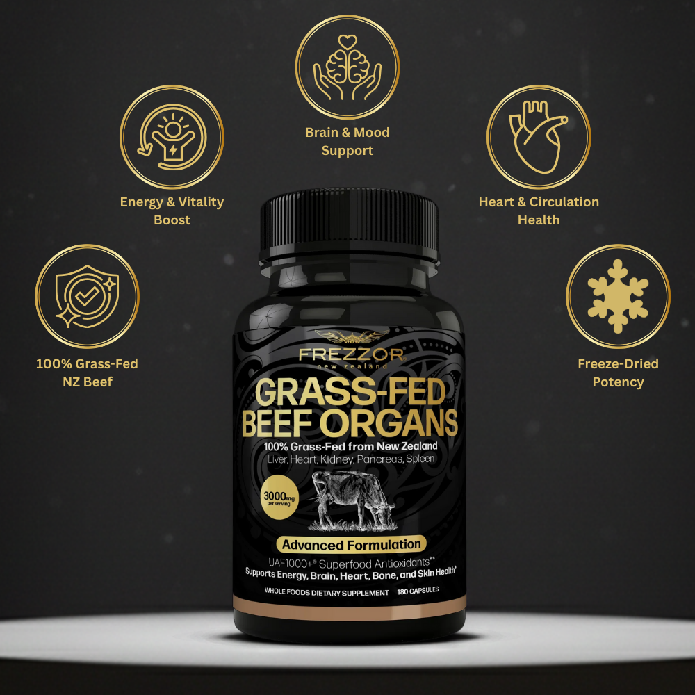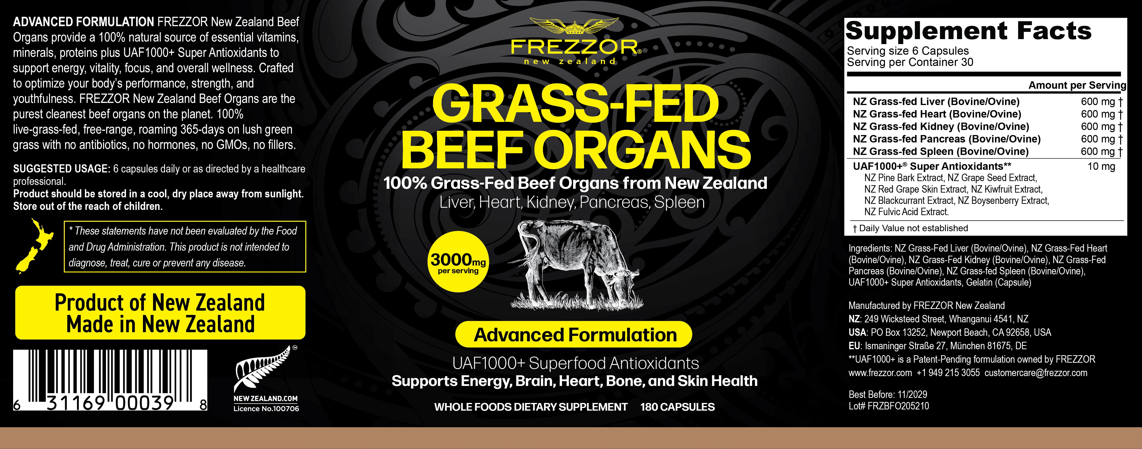 FREZZOR Beef Organs is a complete, whole-food supplement that supports total-body health, energy, and resilience — all from the most nutrient-dense foods on earth: organ meats. Each capsule delivers pure nutrition from five powerful organs — liver, heart, kidney, pancreas, and spleen — sourced exclusively from 100% live-grass-fed, free-range New Zealand cattle.