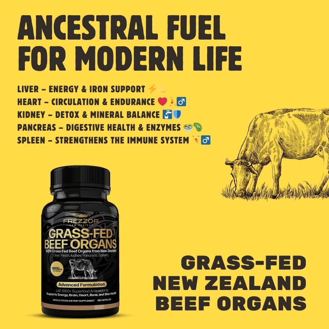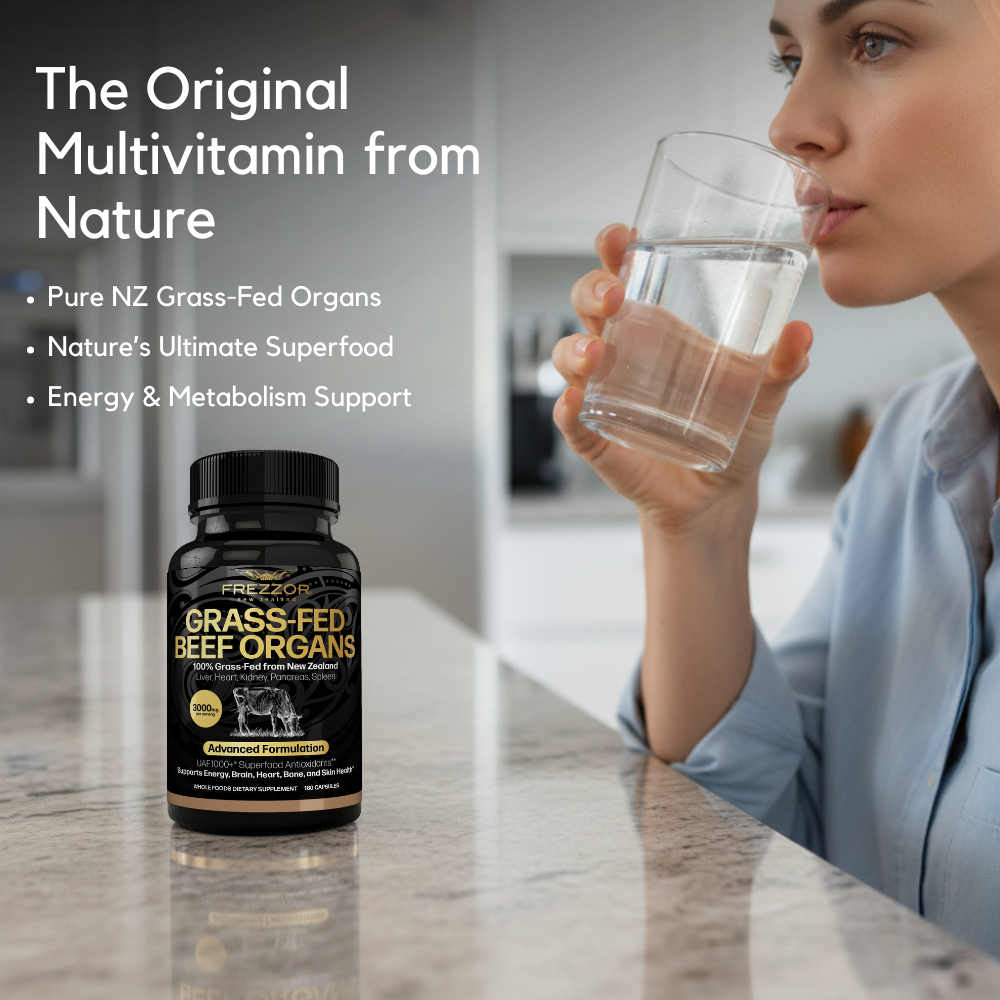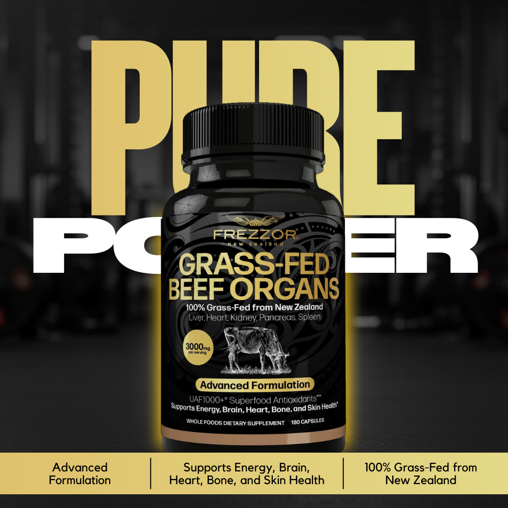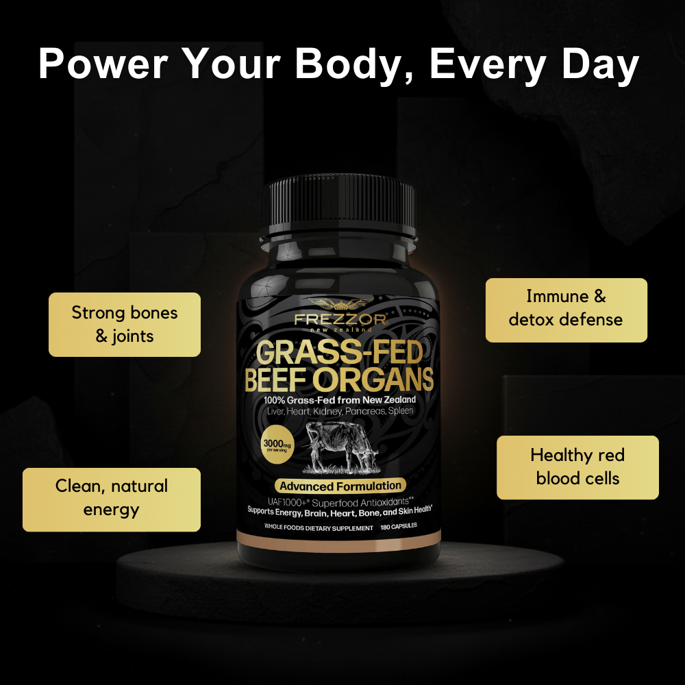 FREZZOR Beef Organs is a complete, whole-food supplement that supports total-body health, energy, and resilience — all from the most nutrient-dense foods on earth: organ meats. Each capsule delivers pure nutrition from five powerful organs — liver, heart, kidney, pancreas, and spleen — sourced exclusively from 100% live-grass-fed, free-range New Zealand cattle.
