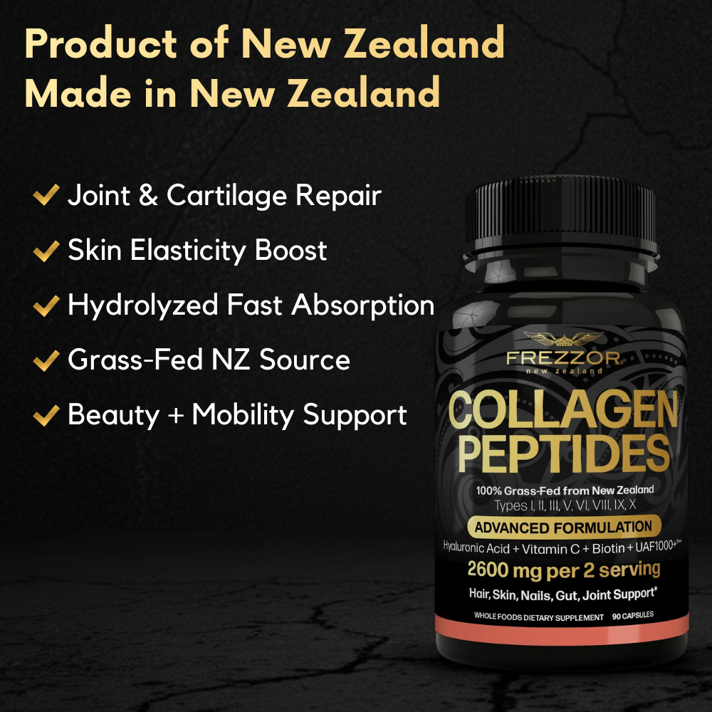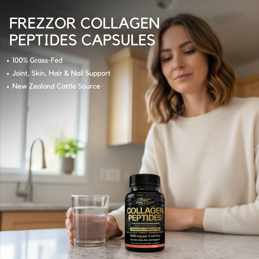 FREZZOR COLLAGEN PEPTIDES Capsules contain the purest source from 100% live-grass-fed, free-range, hormone-free, antibiotic-free New Zealand cattle.