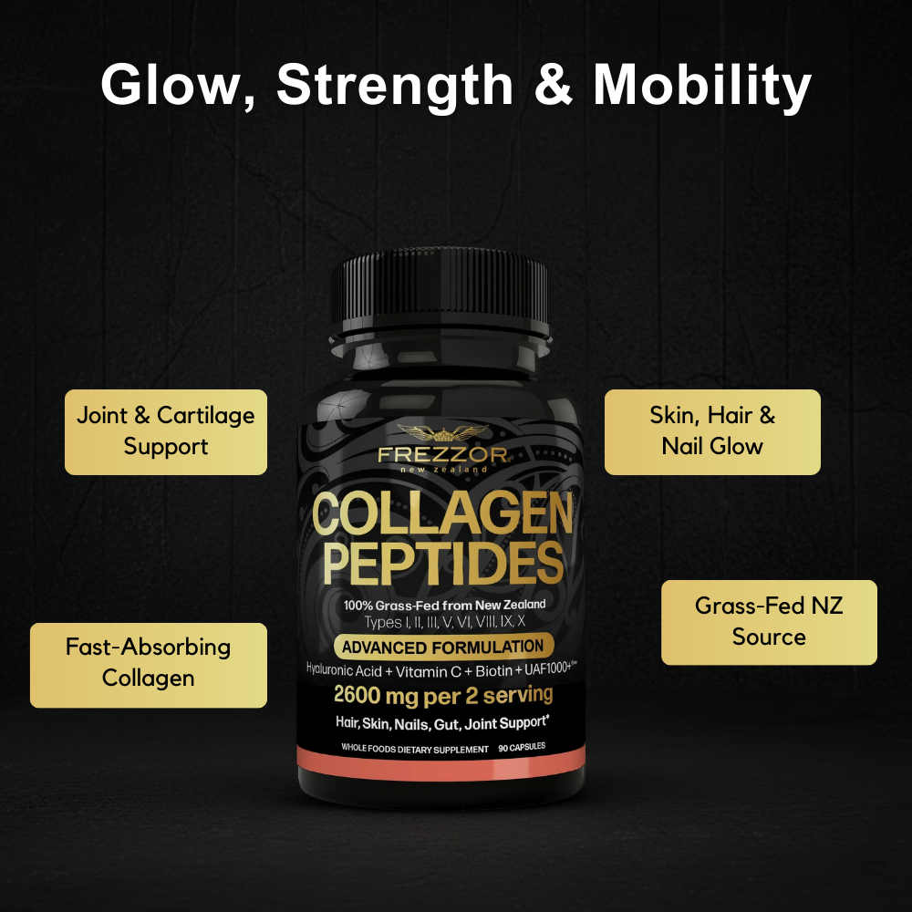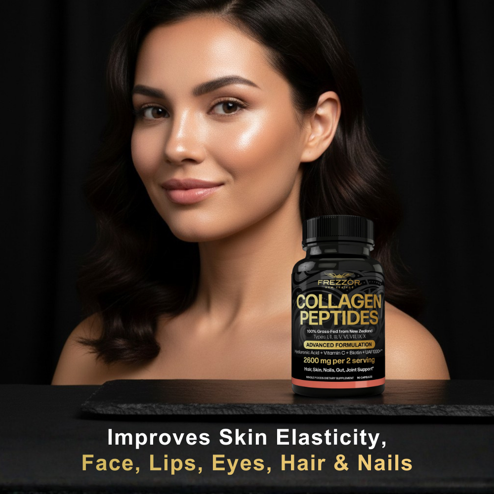 FREZZOR COLLAGEN PEPTIDES Capsules contains Noel Turner's "Seven Sacred Superfood" Antioxidants that synergize with collagen perfectly, protecting you from the free-radical-toxin oxidation, the root of aging that breaks down collagen within the body.