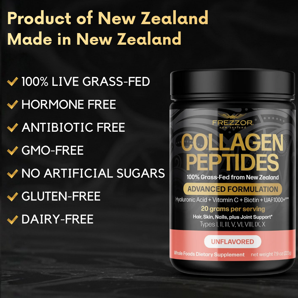 FREZZOR COLLAGEN PEPTIDES Powder contain the purest source from 100% live-grass-fed, free-range, hormone-free, antibiotic-free New Zealand cattle.