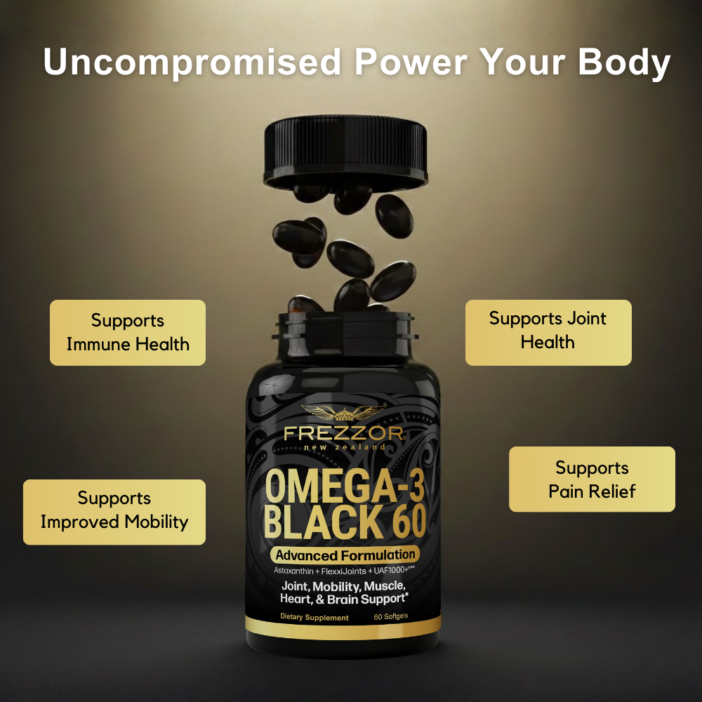 This innovation became the foundation of FREZZOR Omega-3 Black—a breakthrough supplement combining New Zealand’s most potent marine lipids with FREZZOR’s exclusive UAF1000+ super-antioxidant blend, delivering 53 times more antioxidant protection than standard fish oil.
