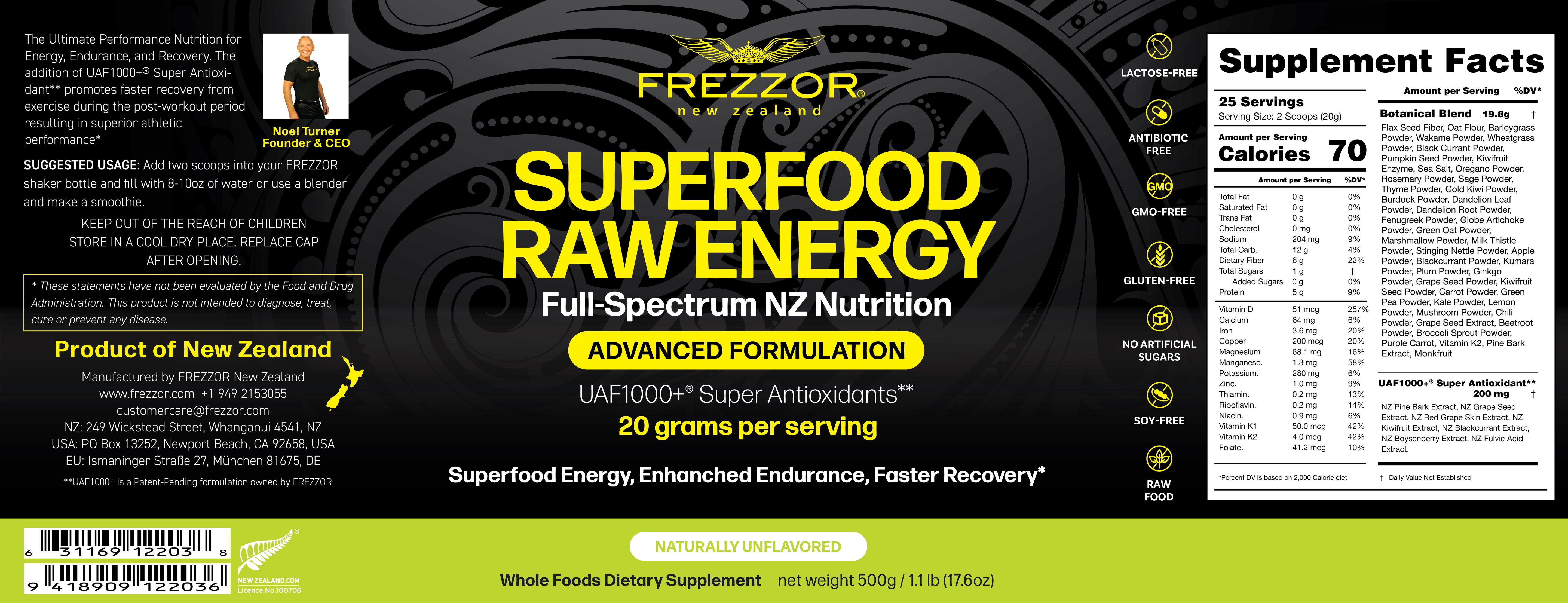 We also include probiotics, prebiotics, enzymes, along with healthy fats and essential fatty acids in our unique blend ofFREZZOR Superfood Raw EnergyPowder.
