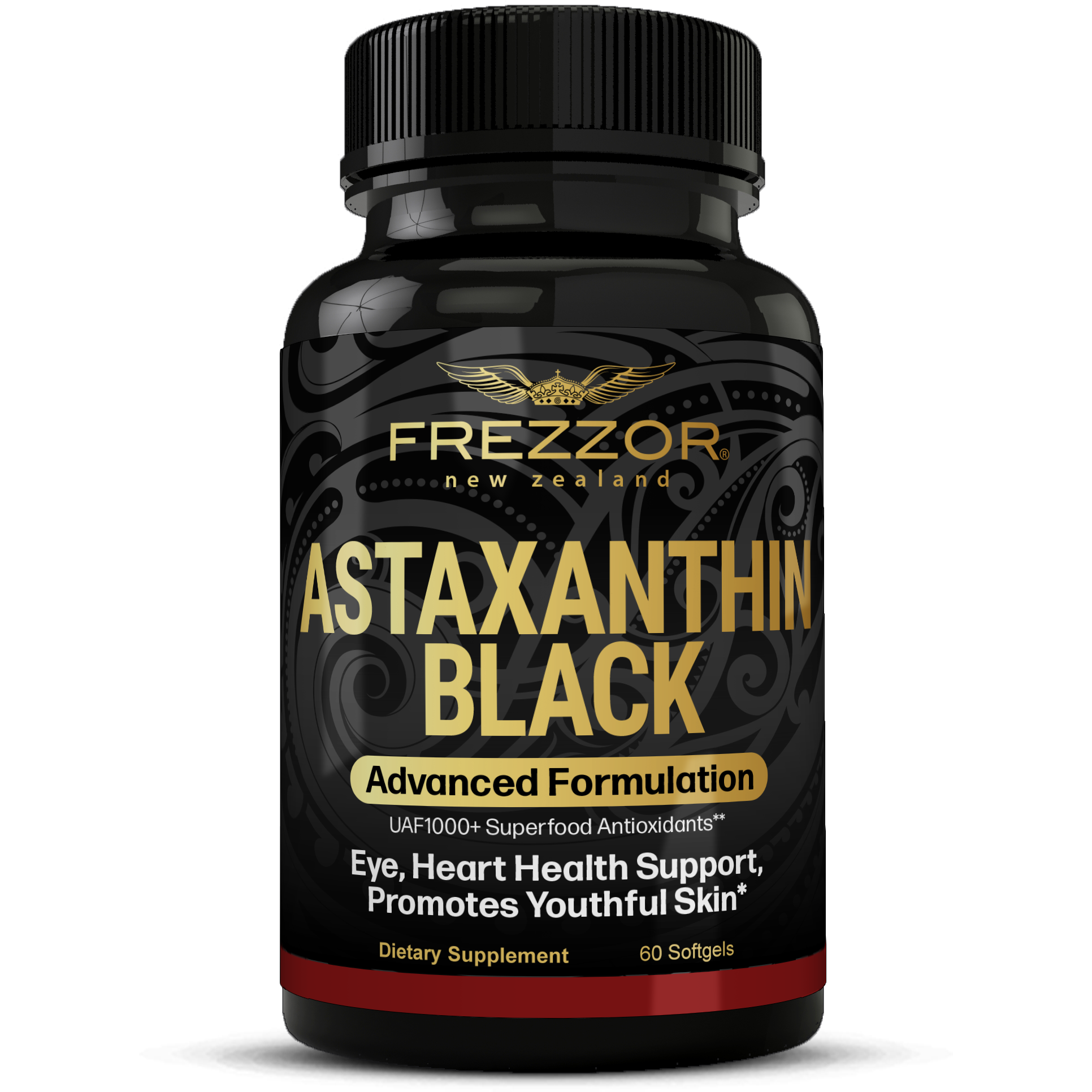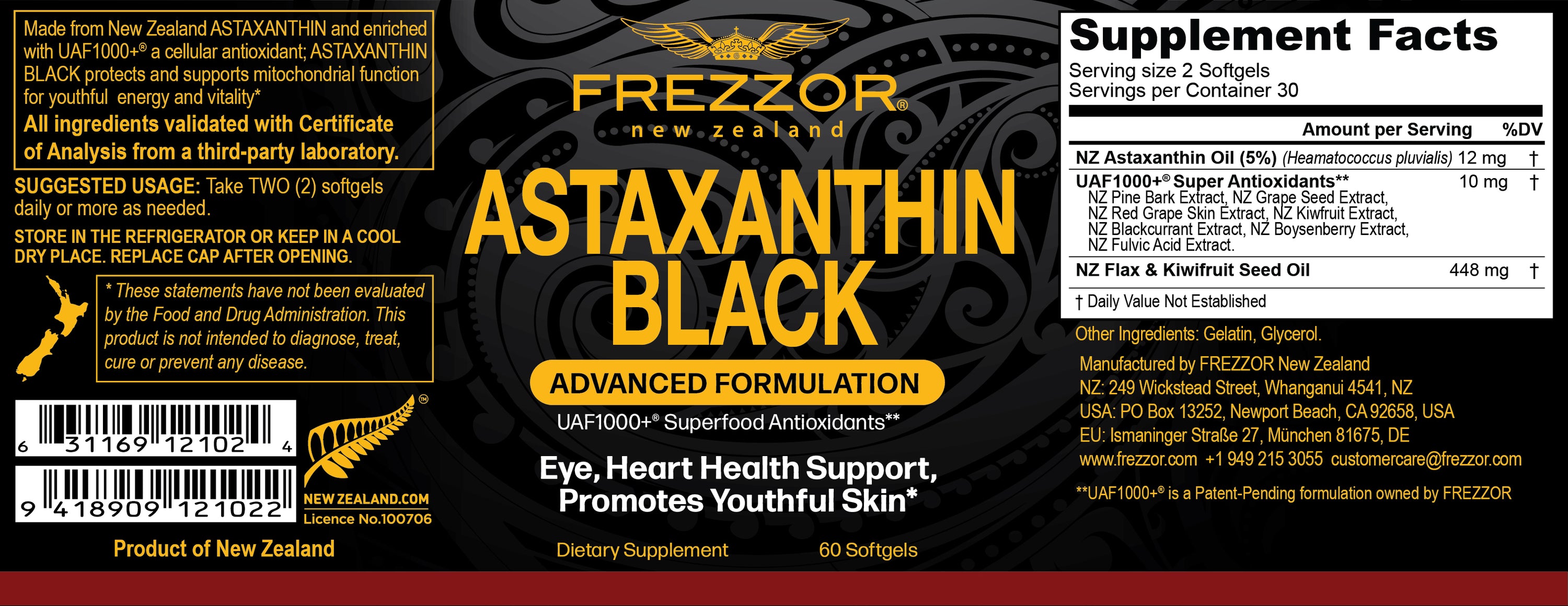 FREZZOR Astaxanthin Black contains optimal levels of New Zealand Astaxanthin, but it has been formulated to be even more effective at protecting your cells with the addition of Noel Turner's Patent-Pending Seven Sacred Superfoods UAF1000+® Super Antioxidants containing Fulvic Acid Extract, Blackcurrant Extract, Pine Bark Extract, Grape Seed Extract, Red Grape Skin Extract, Kiwifruit Extract, and Boysenberry Extract. FREZZOR Astaxanthin Black is 10X more anti-inflammatory* than standard astaxanthin - guaranteed!
