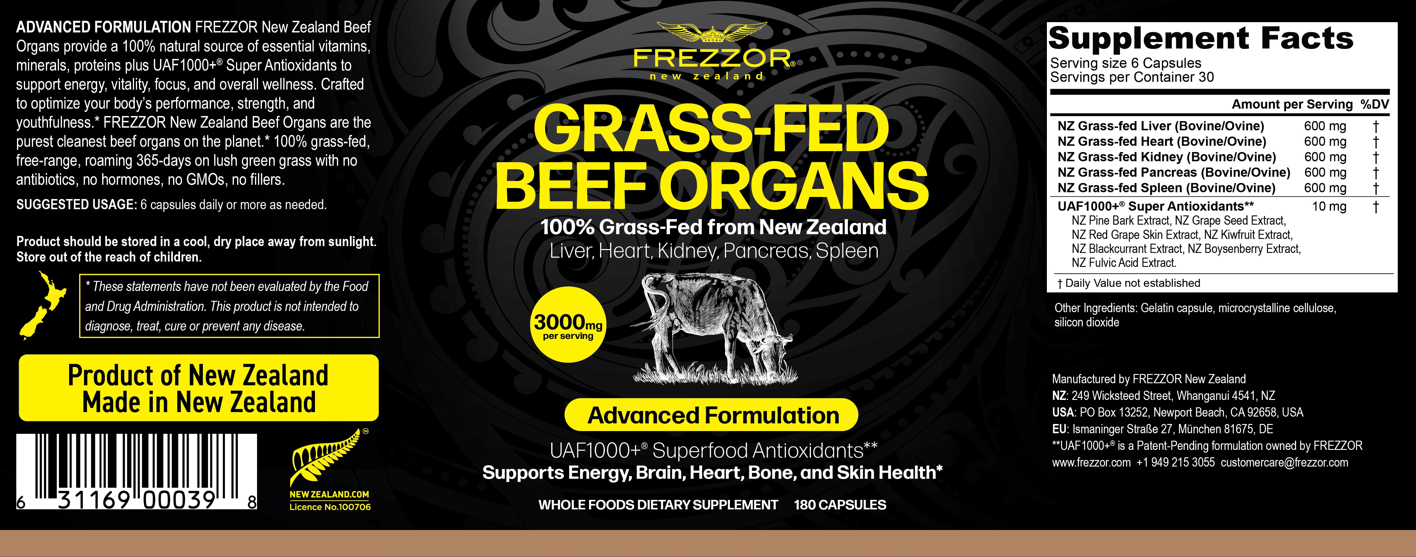 FREZZOR Beef Organs is a complete, whole-food supplement that supports total-body health, energy, and resilience — all from the most nutrient-dense foods on earth: organ meats. Each capsule delivers pure nutrition from five powerful organs — liver, heart, kidney, pancreas, and spleen — sourced exclusively from 100% live-grass-fed, free-range New Zealand cattle.