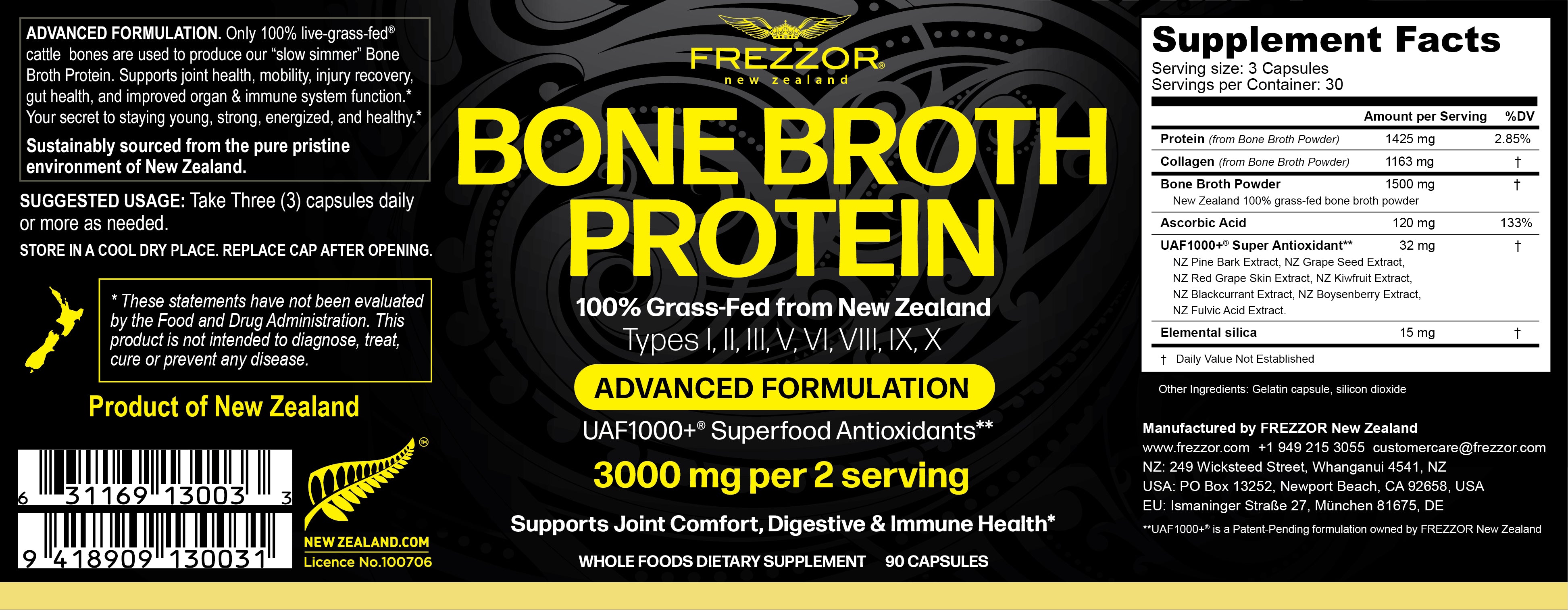 FREZZOR Bone Broth comes from New Zealand. Because quality is close to our hearts, we only use bones from *live-grass-fed" pasture-raised cattle from New Zealand.