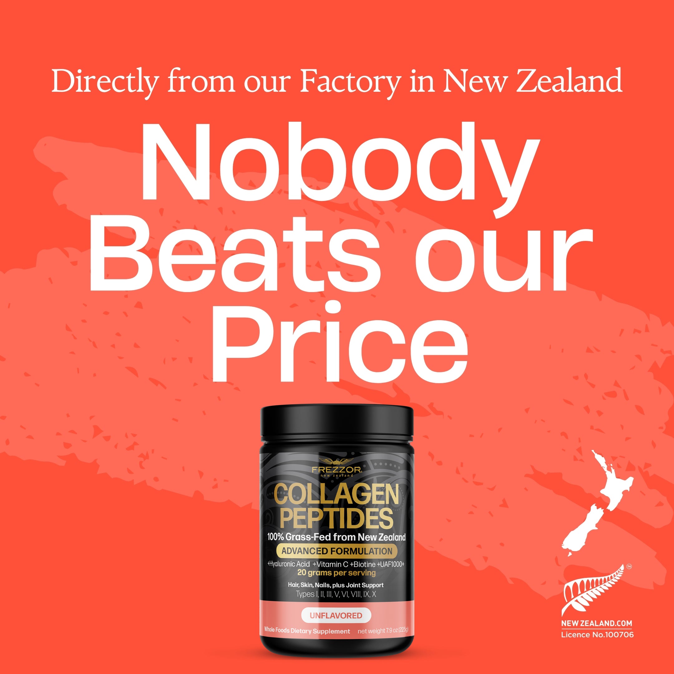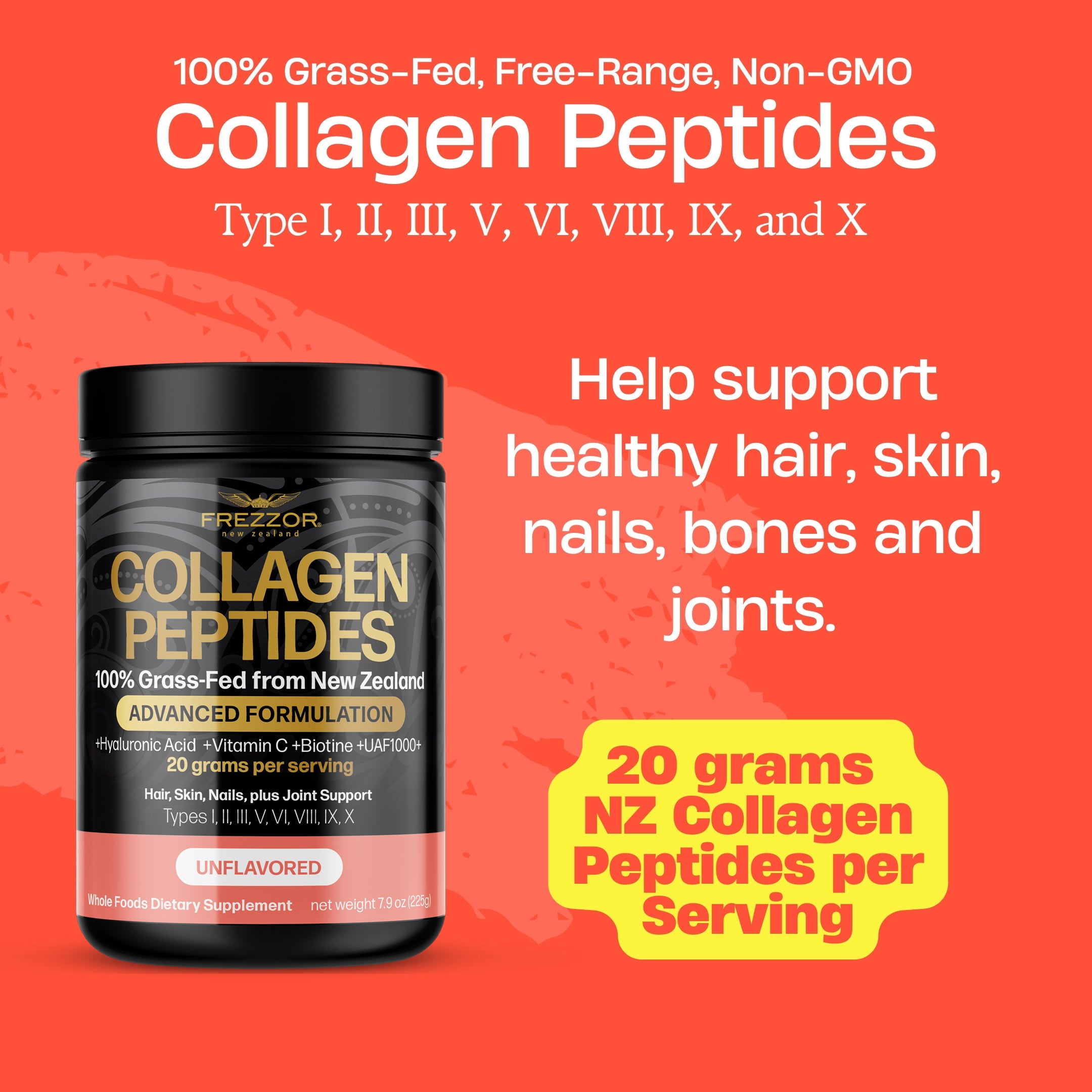 FREZZOR COLLAGEN PEPTIDES Powder contain the purest source from 100% live-grass-fed, free-range, hormone-free, antibiotic-free New Zealand cattle.