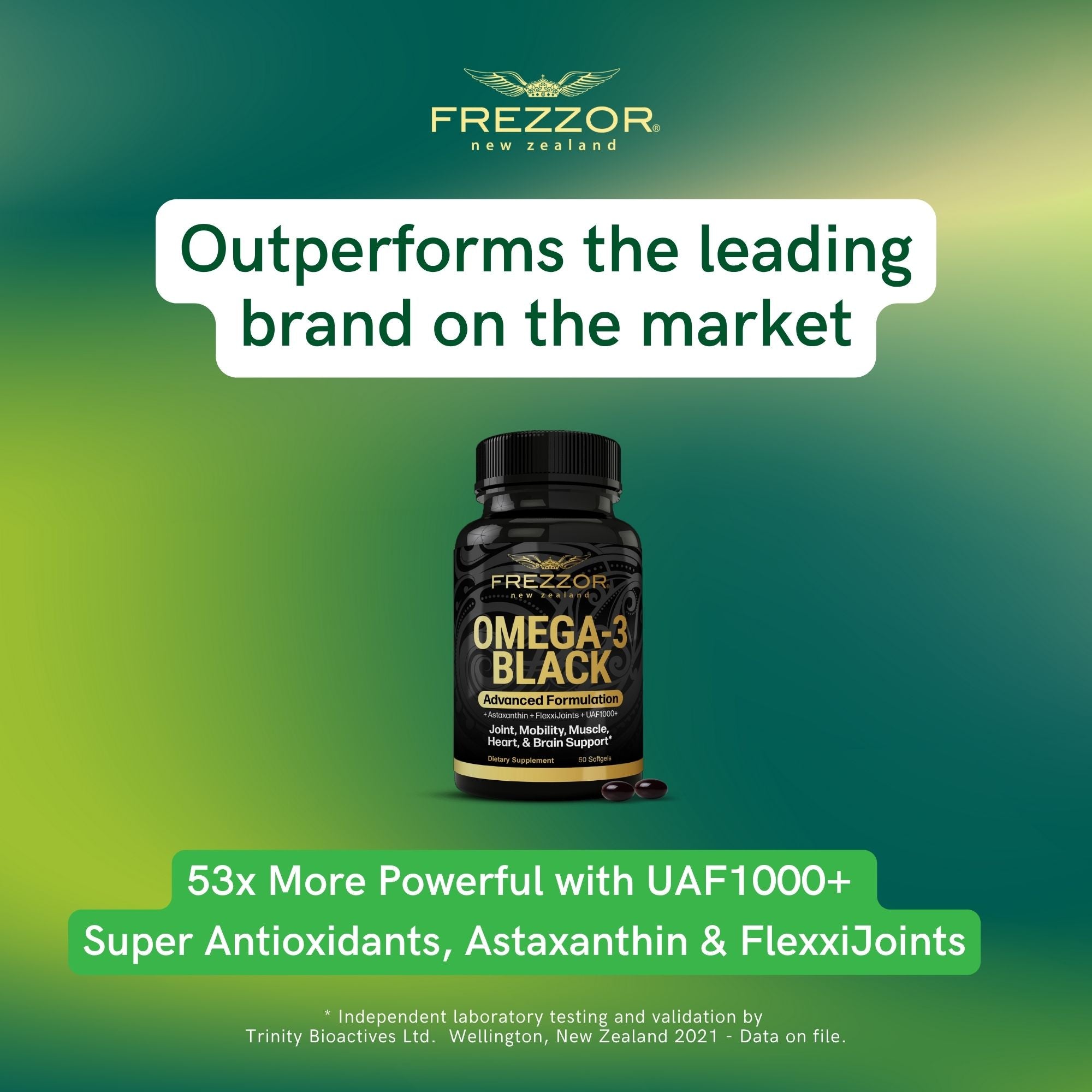 This innovation became the foundation of FREZZOR Omega-3 Black—a breakthrough supplement combining New Zealand’s most potent marine lipids with FREZZOR’s exclusive UAF1000+ super-antioxidant blend, delivering 53 times more antioxidant protection than standard fish oil.