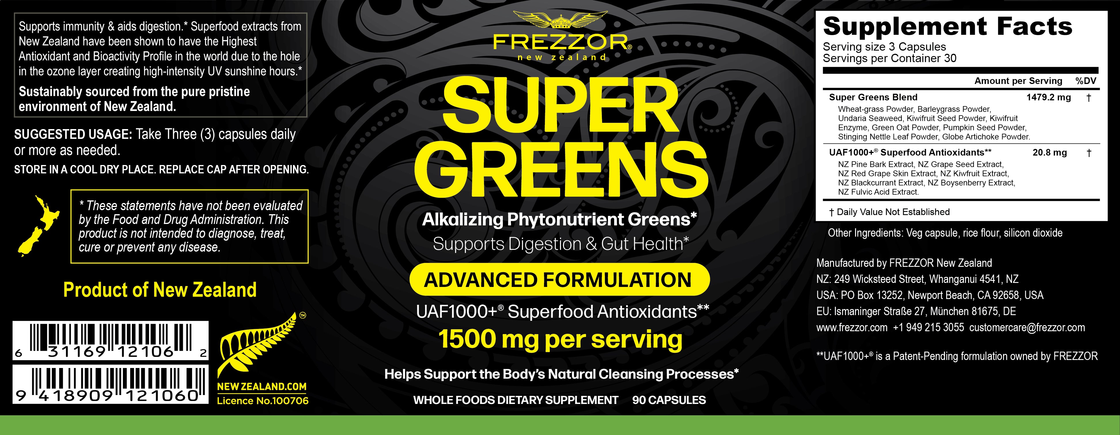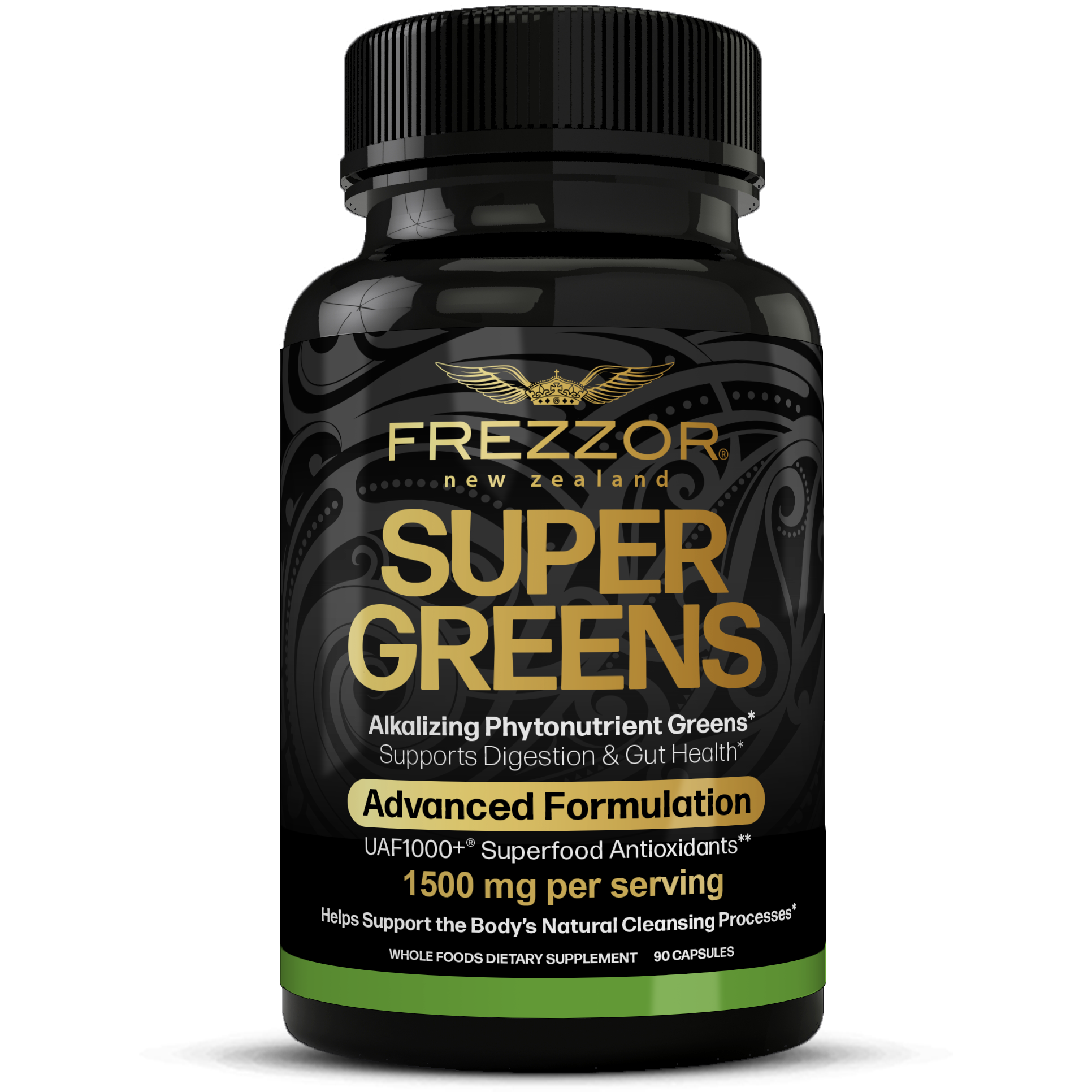 Your daily Superfood Greens in just 3 Capsules: FREZZOR SUPER GREENS Capsules are loaded with a blend of New Zealand grown whole foods, including super fruits, vegetables, grasses, and marine greens. Every serving contains 18 New Zealand grown, nutrient-rich, bioenergetic and chlorophyll-loaded plant powders that promote whole-body health, intestinal support, and increased energy levels.